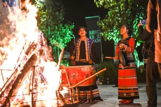 终点处点燃着劈啪作响的篝火,火光中,选手们有模有样地和少数民族的姑娘小伙跳起普洱少数民族最古老的舞蹈,一时间,鼓声、笑声、山歌声,响彻夜空。